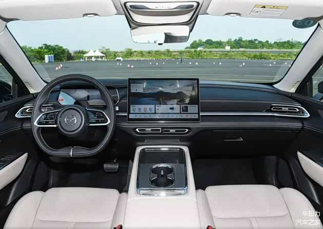 马自达EZ-6的内饰设计略显传统,还是坚持采用了独立的中控屏和仪表盘,整个中控台面也比较平直简洁,这里基本找不到什么物理按键,功能操作全部交给了中控屏、方向盘和语音控制系统。