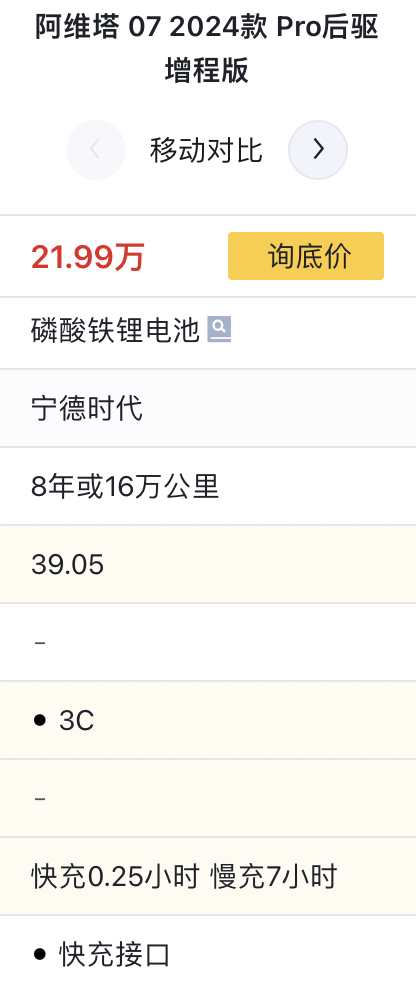 比如,宁德时代曾推出过一款神行超级增混电池:采用磷酸铁锂电芯,支持 3C 快充,两个容量版本中 39 度电池包续航 245km,52.4 度电池包续航 325km,阿维塔 07 增程版搭载的就是这款电池。