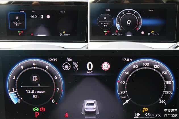 仪表盘的界面,主要有如下图所示的3种:第1种以数字为主,科技感较强;第2种将时速表摆在中间,有点儿赛车范儿;第3种是传统的双表造型,中间的多功能显示区,透露出时代感。