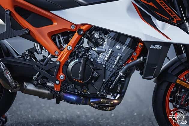 动力方面,990 Duke R 搭载一台LC8c Parallel-Twin直列双缸水冷四冲程发动机,实际排量为 947cc,采用DOHC四气门结构设计,经过 KTM 的精心调校,新车的转速限制得到了提升,峰值功率输出从普通 Duke 的123匹提升至了130 匹,在9500 rpm 时爆发。峰值扭矩保持不变103Nm/ 6750 rpm 。这一变化让 990 Duke R 在加速时更加迅猛,为骑行者带来了极至的速度体验。