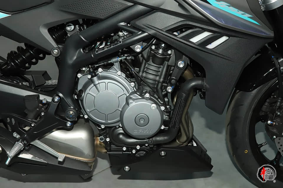 动力方面,450R搭载与450RR同平台设计的直列四缸水冷发动机,排量443cc,最大马力65.3匹,最大功率48kW,最大扭矩40Nm。动力输出积极,低扭表现优异,并设计有新手保护模式。