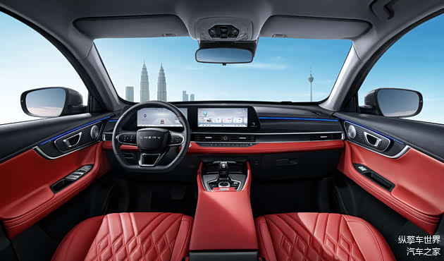 内饰方面,2025款瑞虎PLUS提供全黑配色,除了顶配车型,其他三款车型都可免费选装黑红内饰。车内的布局延续了老款车型的设计,配备了26.4英寸双联屏、贯穿式空调出风口、水晶钻石挡把以及手机无线充电板。
