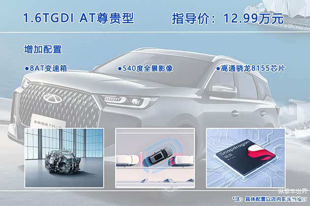 顶配车型的价格又提升了1万元,不过配置只换装了8AT变速箱,增加了540度全景影像以及高通8155芯片,配置提升并不明显,而且价格也来到了来到了13万的区间,虽然支持选装索尼音响、64色车内氛围灯、自动空调、L2级智驾辅助系统等,但对应的价格也要高出不少,不如择尊贵型更有性价比。