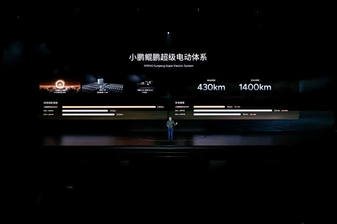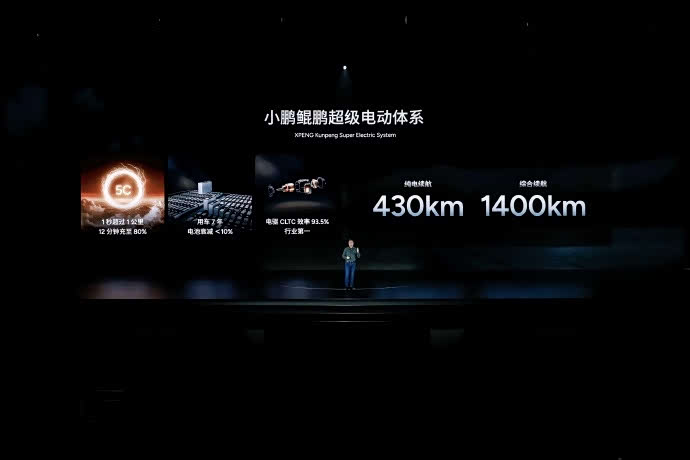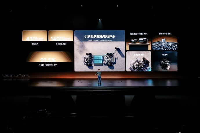 从技术层面来看,小鹏鲲鹏超级电动体系涵盖全域800V高压碳化硅平台、5C超充AI电池、混合碳化硅同轴电驱、静音增程器(运行噪音仅为1dB)、AI电池医生和AI动力功能等技术,可实现“1秒充电1公里”,仅需12分钟即可充满80%,电驱CLTC效率高达93.5%,但体积仅为上一代电驱的1/3,纯电续航达430km,综合续航里程超1400km。