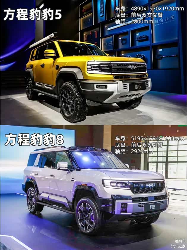 在车身尺寸方面,豹 5 的长宽高分别为 4890mm、1970mm、1920mm,轴距为 2800mm。豹 8 的整车长宽高为 5195mm、1994mm、1875mm,轴距达 2920mm。很明显,豹 8 更长更宽,拥有更大的车身尺寸,不过高度相对降低了一些。豹5整体偏硬派,以复古潮流的方盒子造型作为设计基础,看起来颇为顺眼。豹8造型则是与比亚迪高端系列仰望U8非常相似,尤其是后尾门的把手设计一致,号称青春版u8。