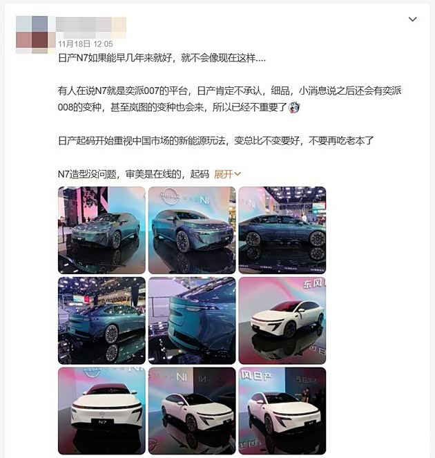 一些博主在文章中提到:“有人猜测N7可能属于奕派007的网络平台,但日产可能并不认同这个观点,而细节,有关于奕派008的变异,甚至包括岚图的版本,现在可能已不再那么那么重要”。对于他来说,日产现在至少开始对中国市场的新能源策略给予更多的注意,持续变总总要比持续改变更好,不应再依赖现有的经验和策略了”。