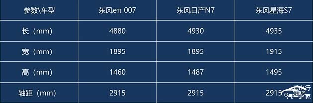 根据公开的资料,东风产N7的标准尺寸是4930mmX1895mmX1487mm,其轴距达到2915mm。东风eπ 007的尺寸为4880mmX1895mmX1460mm,轴距达到2915mm,其车身大小和轴距与东风日产N7一致。除非是纯粹的偶然,否则这种指标确实会让人不禁联想到两辆车之间的深厚纽带。
