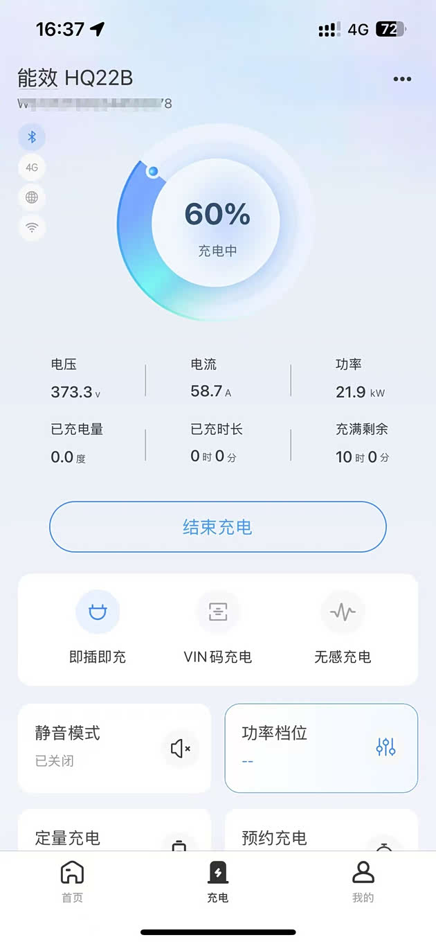 安装完成后,迫不及待地开始测试。因为我买的蓝牙版,所以只能通过蓝牙连接充电桩。下载能效的APP后,测试充电功率,从APP中可以看到,能够达到21.9kW,基本满功率充电,这点还是很不错的。