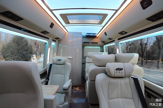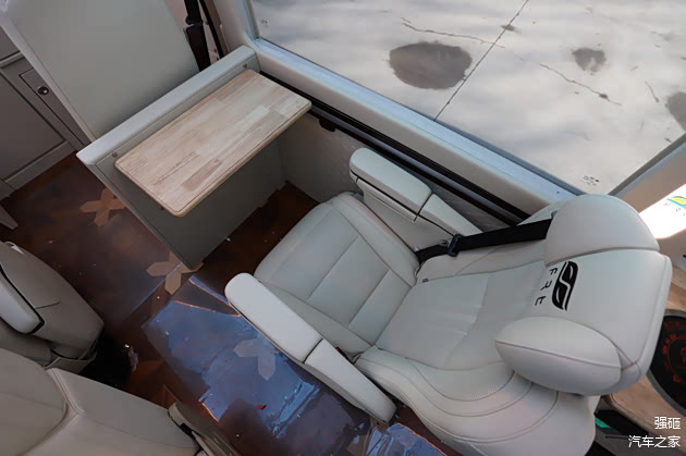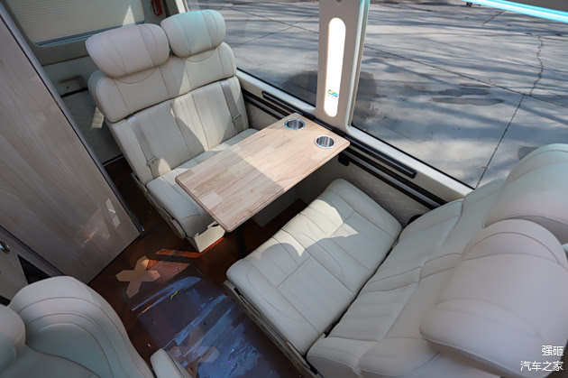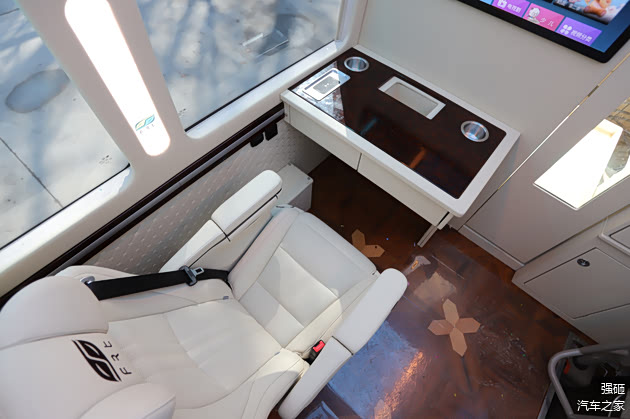 首席位配置的是阿尔法航空座椅,集透气孔、通风、加热、气动按摩功能于一体,并配备一张豪华木纹办公桌,桌面嵌入式安装两个杯孔、纸巾盒和无线手机充电,并配有话筒挂架、插座,侧面则设计有发光标牌。