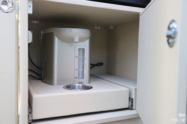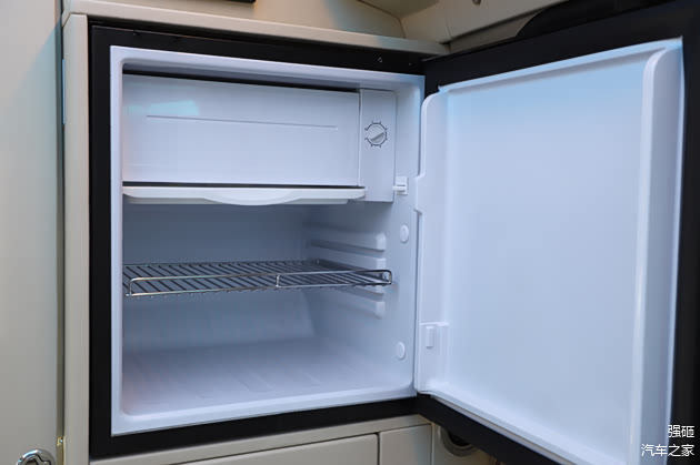 中门右侧配置了50L冰箱、暖水壶和储物柜。左侧是一张导游座椅。