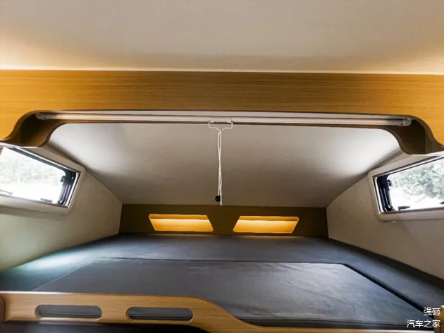 额头床悬浮于驾驶室顶部,内部空间宽敞明亮,除了能睡2人外,最内侧还提供了储物空间。
