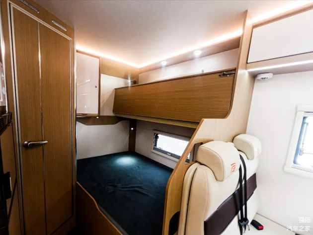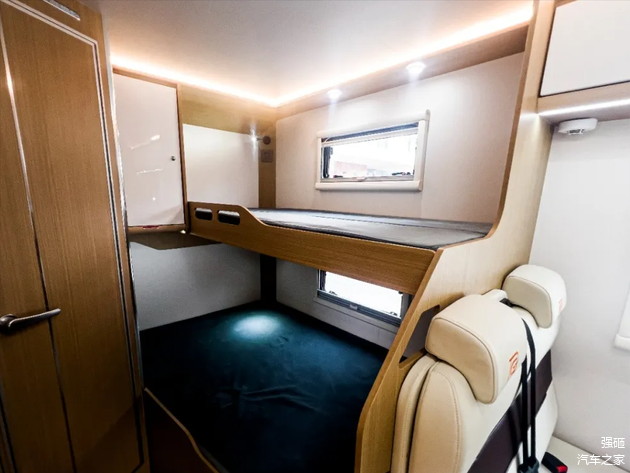 车内主卧配备一张纵置子母床,整体采用黄白双色设计,床头软包,提升睡眠空间的温馨感和品质感。功能上,主卧还配备有电源插座、独立照明灯、通风观景窗、储物柜等多样实用功能。