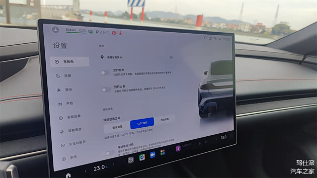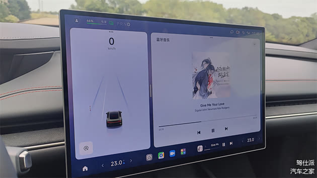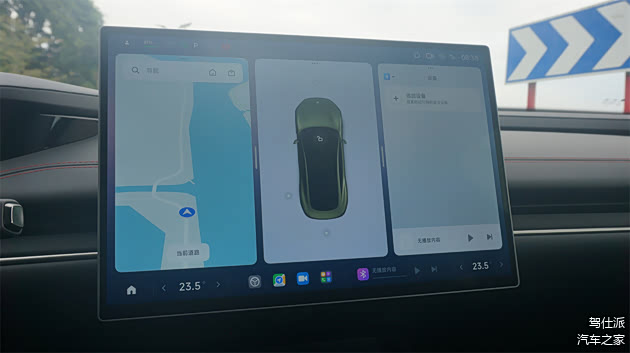 再来看看小米引以为傲的MIUI在车上会是个啥水平。在上电前,车辆首页会有一个非常炫丽的全屏3D车控界面,进入READY状态之后就会是这个经典的“三屏分立”的界面:左侧地图、中央车控/智驾、右侧多媒体,三个区域还允许自行拖拽,流畅度和美观程度属于免检水平。另外左上角还有额外的电量和档位显示,用来弥补仪表显示信息不足的问题。