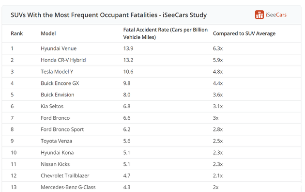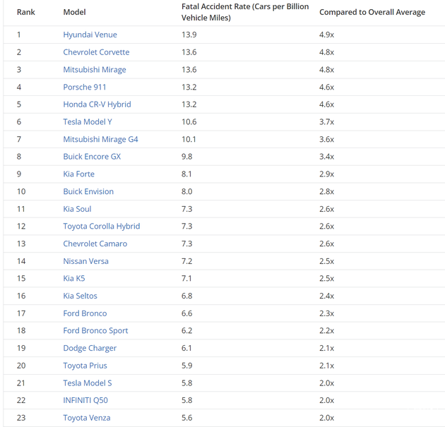 最近美国公路安全保险协会(IIHS)根据2018-2022年全美致命交通事故数据统计,总结出在美国道路上最危险的23款车型,其中前五名最危险的车型是现代Venue、雪佛兰科尔维特、 三菱Mirage、保时捷911和本田CR-V混动,它们的发生致命事故率几乎是其他车型的五倍,据统计这五款车型在同类交通事故中,乘员出现致命情况的几率最高,这些数据来自美国国家公路交通安全管理局的致命事故分析报告系统(FARS),每起事故至少造成一名乘员死亡才会进入统计报告。