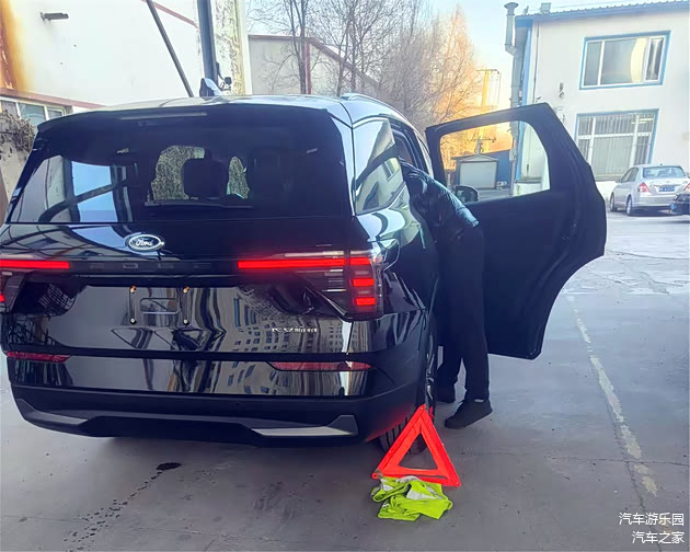 例行检查,车内应该有的东西,马甲,警示牌,灭火器,还有什么了,我都忘了,反正都提前准备了,这都不是事。再来看看全新的锐界L,这屁股看起来就敦实,有一定的厚重感,主要是美系车主打的就是皮实耐造,还有飞翼型的尾灯设计,辨识度很高,动态效果也是很好的