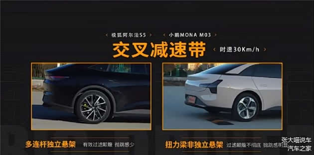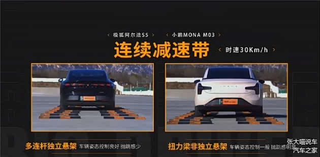 在交叉减速带测试中,极狐阿尔法S5的独立悬挂结构使得左右车轮的震动不会相互影响,传递到车内的余震较小,乘坐体验更加平稳。而小鹏MONA M03则因悬挂结构的限制,左右车轮的震动相互叠加,导致车内晃动加剧。