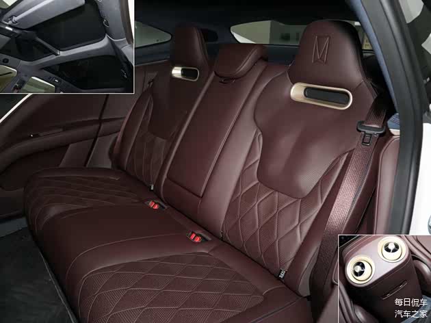 后排座椅采用前排相同的一体头枕,同样有运动感。真皮材质增加菱形缝线,显得高级。坐垫长度略微偏短、靠背侧向支撑不错,整体舒适性良好。这台高配车型,后排座椅同样提供通风、加热和按摩,但没有提供纯电版的靠背角度调节。空间方面,侃弟身高175cm,腿部有三拳,头顶一拳略多,横向充足,地板为全平。提供地台出风口、分段式天窗、可翻折扶手带双杯架。