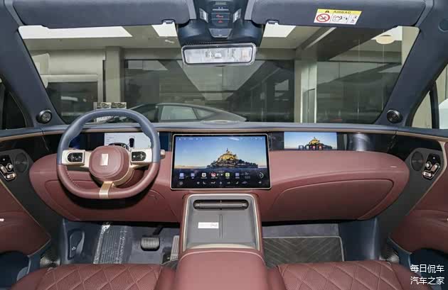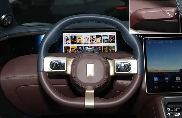 真皮材质方向盘采用双色搭配,与车厢风格统一,增加金色元素点缀显得非常精致。横辐上的控制区也很简洁,采用触控+滚轮组合,后方有电子怀挡。方向盘上的摄像头除了能实现疲劳监测,还能识别驾驶员的情绪,主动开启音乐灯光秀提神,智能化程度很高。