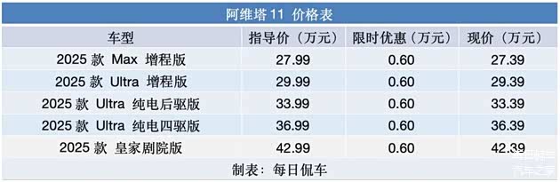 阿维塔在今年推出07车型后,销量迎来实质性增长,在10月和11月连续两个月销量破万,其中增程式动力占据主力。这足以证明在中大型车市场,新能源品牌最好是纯电与增程两条腿走路。所以,对于另外两款车型的更新也迫在眉睫,继11月初阿维塔12的2025款车型增加了增程版之后,12月初,阿维塔11的2025款车型也正式上市了,新车同样推出了增程式与纯电车型,5款新车的售价区间是27.99-42.99万元,12月31日前大定的用户可享六大限时权益,包括6000元的保险补贴。近日,我们对阿维塔11的2025款Ultra增程版进行了实拍,一起看看新车表现。