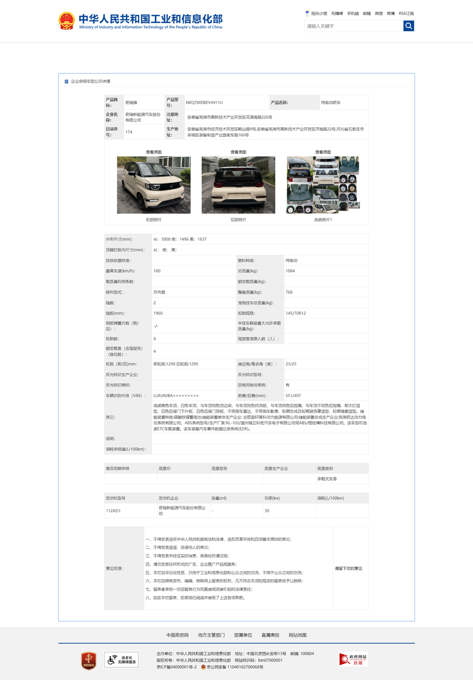 新款奇瑞QQ冰淇淋曝光:国轩高科电池,奇瑞电机 外形尺寸(mm):长:3008 宽:1496 高:1637 轴距(mm):1960 总质量(kg):1084 整备质量(kg):768 最高车速(km/h):100 电池:磷酸铁锂蓄电池;储能装置单体生产企业: 合肥国轩高科动力能源有限公司;储能装置总成生产企业:芜湖奇达动力电池系统有限公司 电机:奇瑞新能源汽车股份有限公司,112AD1,峰值功率30kw
