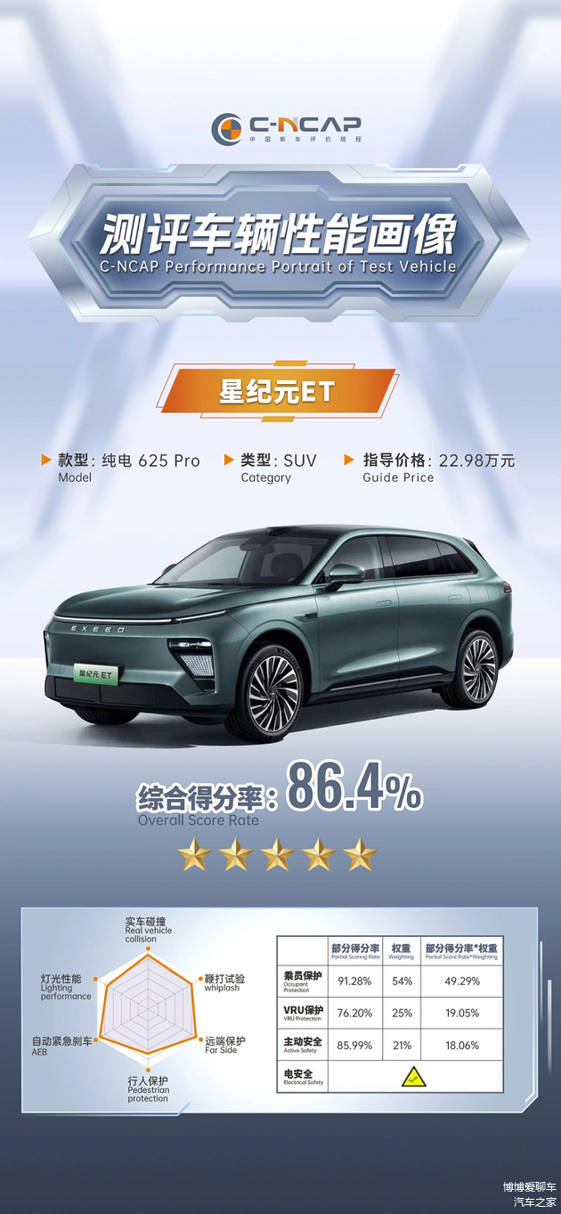 在本次2024版C-NCAP的测试中,得益于在主动安全、被动安全及电池安全方面的出色实力,星纪元ET在成员保护、VRU(弱势道路交通参与者)安全及主动安全测试中均斩获了优异成绩。