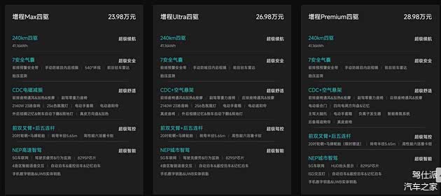 说回产品本身,这次四驱版价格区间23.98-28.98 万元,跟问界M7、理想L6大差不大差。置换政策大家都能享受,所谓的置换价可以先不看。我觉得吸引点就是26.98万的Ultra四驱版就带了空悬+CDC,带来了硬件维度上的提升。
