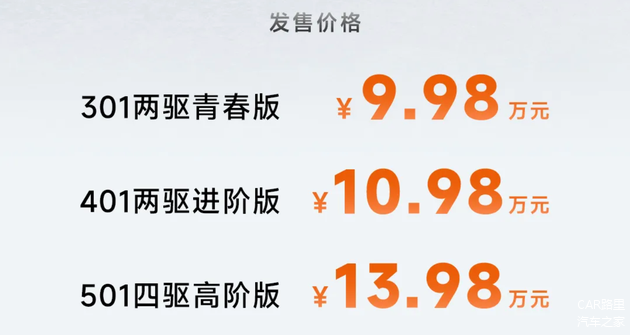 至于顶配的501四驱高阶版,它的价格来到了13.98万元,电池包容量更大,轮毂升级到21寸,更关键的是配备了四驱,新增了越野模式,可玩性更高。不过这个版本依旧可以选装价值1万元的科技舒适套装。也就是说,如果全部配齐的话,这款车价格得来到15万元,价格并不算特别便宜。