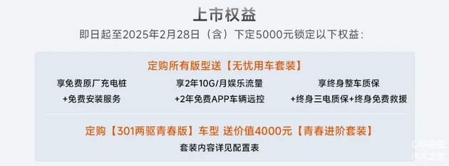 值得注意的是,如果在指定日前下定还可以享受价值4000元的青春进阶套装,比如固定式侧踏板、热泵空调、PM2.5过滤装置、手机蓝牙钥匙(带蓝牙无感进入)等,这样一来,其配置基本上就和价格10.98万的401两驱进阶版相当。