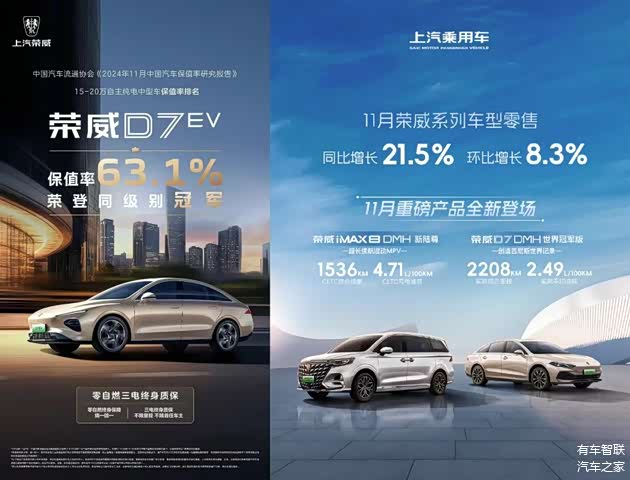 中国汽车流通协会发布的《2024年11月中国汽车保值率研究报告》里,荣威D7 EV以63.1%的保值率,成为15-20万级自主纯电中型车榜单的冠军。市场端表现同样亮眼,11月份荣威系列车型销量同比增长21.5%,环比增长8.3%。