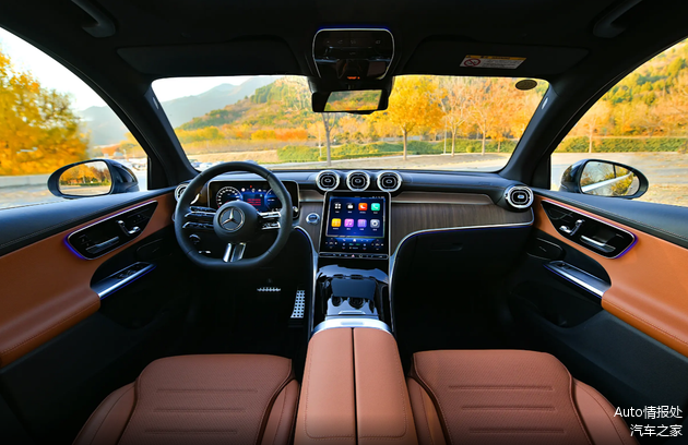 奔驰GLC PHEV典藏版在内饰方面,由黑色和棕色组成,内饰的质感和氛围感还是比较不错的,全液晶仪表的尺寸为12.3英寸,中控屏幕的尺寸为11.9英寸,车机芯片采用高通骁龙8295,部分配置将以选装的方式提供。