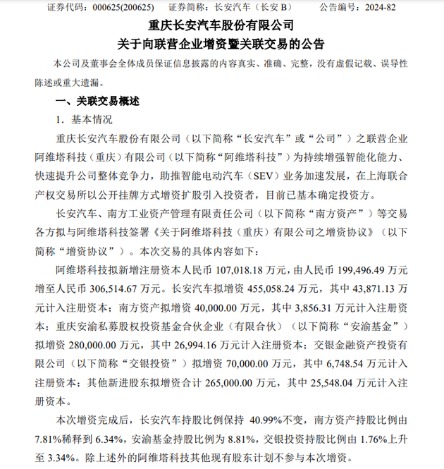 重庆长安汽车股份有限公司发布的公告显示,阿维塔在上海联交所以公开挂牌方式增资扩股引入投资者,目前已经基本确定投资方。阿维塔官方介绍,本轮融资由长安汽车、渝富系基金、南方资产系基金、国投系基金、交银投资以及其他战略和市场化投资人共同出资。