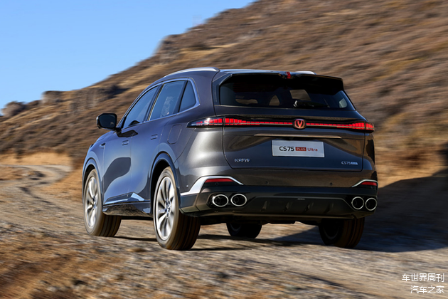 尾部方面,长安CS75 PLUS Ultra采用了贯穿式尾灯组,内部灯腔结构复杂,营造出不错的立体视觉效果。此外,新车还配备了造型别致的扰流板设计以及双边共四出的排气布局,运动感十分突出。