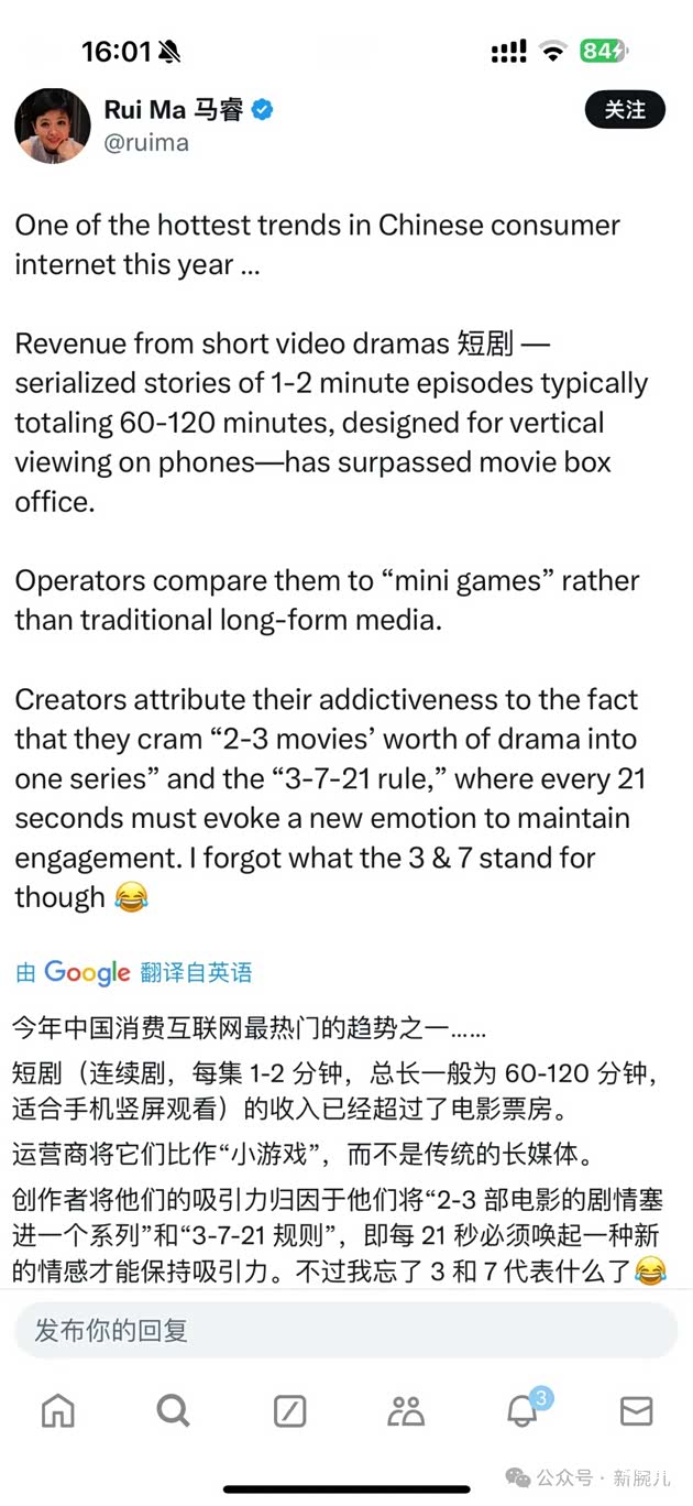 一名叫做马睿的网友在X上发帖称,中国的小短剧票房已经超越了电影市场,平台运营商将短剧称作小游戏,而不是对标长剧。