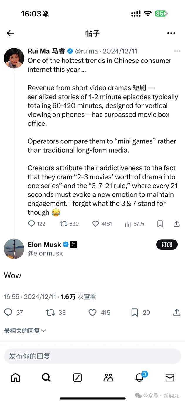 12月25日消息,世界首富马斯克在12月11日对中国短剧实市场规模超过电影进行了点评,居然被短剧圈忽略了。