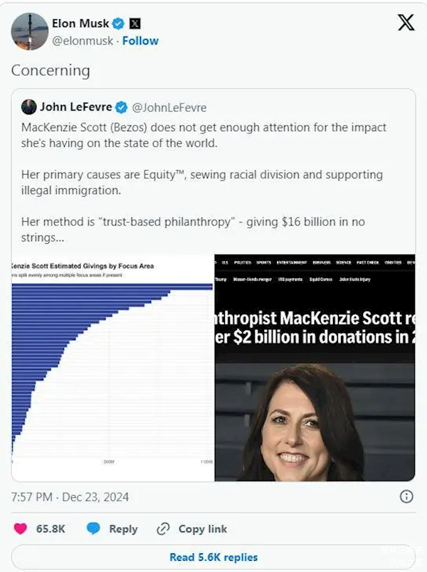 快科技12月25日消息,据媒体报道, 近期,美国亿万富翁埃隆·马斯克再次对亚马逊创始人贝佐斯的前妻斯科特的慈善捐赠提出了质疑。据了解,马斯克本周分享了一篇批评斯科特的帖文。