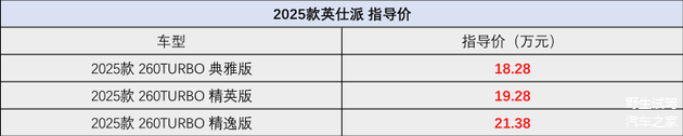 2025款英仕派全系均搭载一台1.5T发动机,最大马力192匹,最大扭矩260牛·米,匹配CVT变速箱,WLTC综合油耗为6.71L/100km。