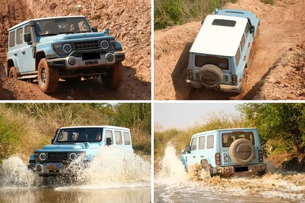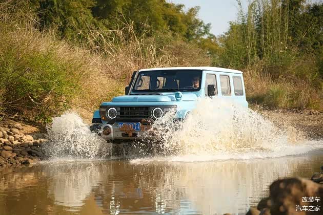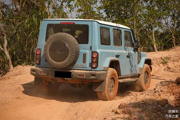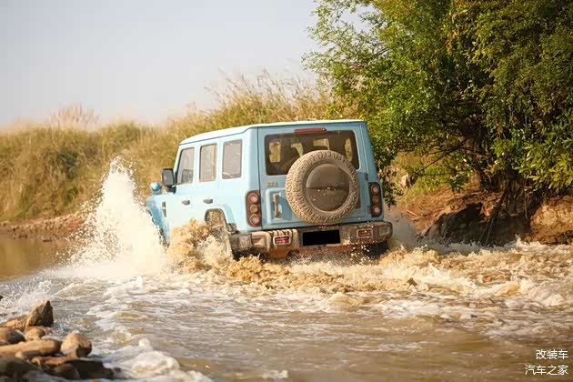 当然,有部分改装是能兼顾美观与性能的。例如上文里提到的越野胎,泥泞路段时能够显著提升它的抓地力;又例如升高的1.5英寸是由氮气减震所提供的,故212 T01长风是能有着43°接近角、39°离去角以及256毫米的最小离地间隙。另外,涉水喉不仅看着帅,910毫米的涉水深度也能让你“玩水自由”。