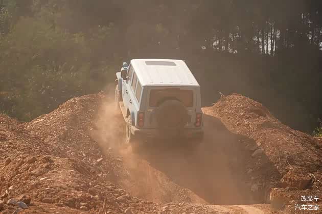 交叉轴都没有构成难度的前提下,排骨路段就更是轻松掌握了。这个时候其实对于车辆的减震以及离地间隙会有更多的考验,好在这套氮气的减震不仅行程够长,且能很好的支撑住车身,依旧是轻点油门、跟随着路面的节奏,自然而然的便通过了这段排骨路。