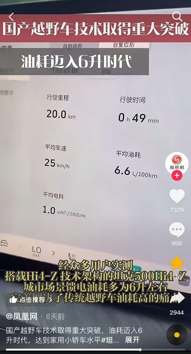 长城汽车新款坦克500HI4-Z 一经推出便备受瞩目,不少网友怀疑耗油耗数据不真实的言论。事实胜于雄辩,我们结合了自身实测和凤凰网关于坦克500Hi4-Z实测油耗的视频,得到了一些真实数据,我们这次行驶路段其中包含城市道路、高架,得到可以轻松控制在6L/100km左右。凤凰网实测坦克500HI4-Z城市场景馈电油耗6.6L/100km,对比官方给出的馈电油耗8.6L/100km,这样出色的油耗表现,让那些恶意声称坦克 500HI4-Z 数据不实言论不攻自破。