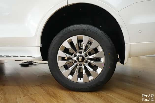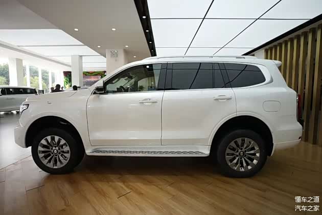 来到车身侧面,方正的车身造型,平直的车身线条,配备亮面19英寸多辐轮圈,车侧搭配固定脚踏板。车身尺寸方面,长宽高分别为5078/1934/1905mm,轴距为2850mm。接近角29度,离去角24度,最小离地间隙210mm。