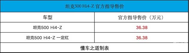 【懂车之道 产品】近日,懂车之道获悉,坦克500 Hi4-Z正式发布上市,共推出2款车型,售价均为36.38万元。新车出自Hi4-Z纵置双电机混联架构。值得注意的是,官方表示,坦克500 Hi4-Z一定红交付周期会延长8周左右。