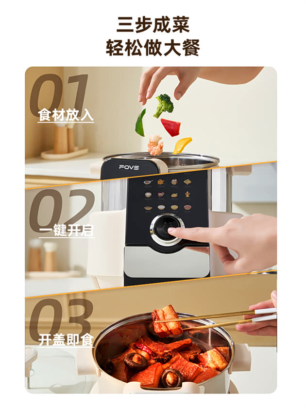 只需简单三步,食材预处理~放入烹饪~一键成菜;一道美味佳肴即可轻松呈现。FOVS智能烹饪机将复杂的烹饪过程化繁为简。食材准备就绪后,您只需将食材和调料按菜谱放入锅中,选择相应烹饪模式,然后静静等待美味出锅。无论是清新爽口的时蔬小炒,还是营养丰富的炖菜汤品,亦或是喷香诱人的肉类大菜,FOVS智能烹饪机都能精准把控每一个环节,让您以最少的精力,收获最令人满意的美味成果。