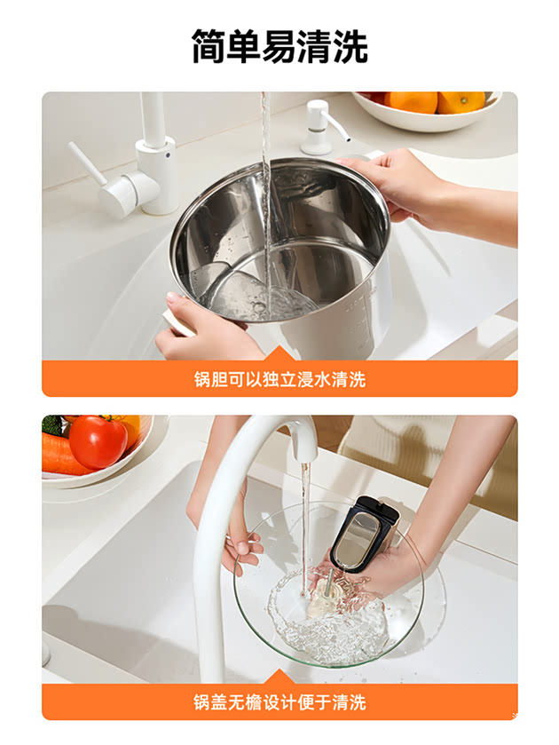 FOVS智能烹饪机采用食品级 304 不锈钢可分离锅体设计,材质安全可靠,坚固耐用且耐腐蚀。让食物在烹饪过程中不易粘锅糊底,不仅大大减少了烹饪用油,使您的饮食更加健康低脂,而且在清洗时只需用清水轻轻一冲,再配合柔软的抹布擦拭,即可迅速恢复光洁如新。锅体与底座可分离的设计,方便您将锅体单独取下清洗或直接端上餐桌,无论是日常使用还是家庭聚餐后的清理工作,都变得轻松便捷,为您节省更多时间与精力。