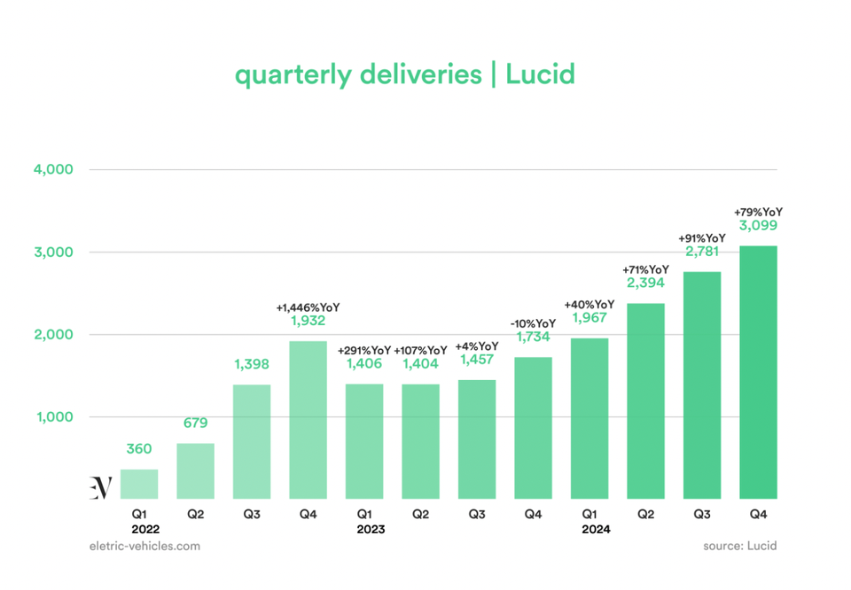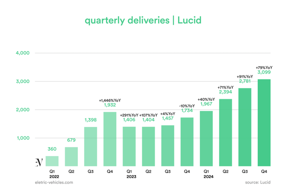 Lucid 2024年交付10241辆新车,同比增长71% 从产量上来看2024年生产了9029辆,交付了10241辆,同比增长71% 一年1万辆,肯定是不及格的 关键还是Lucid的第二款车,Gravity在24年底开始交付了 在美国那边,大SUV肯定比大轿车好卖很多