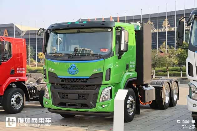 乘龙H7氢燃料牵引车:搭载国鸿第三代鸿芯高性能电堆150kw燃料电池发动机,88.3度动力电池,6*410L储氢瓶。动力链为朗高250/360kw电机+6AMT+5.571速比后桥。氢燃料电池是以氢气为燃料,通过化学反应和质子交换将电池中的化学能转变为电能的发电装置,通过绿电实现全生命周期的零碳排放。