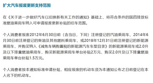 其中有一条就是汽车以旧换新补贴通知,国补在《关于进一步做好汽车以旧换新有关工作的通知》基础上,将符合条件的国四排放标准燃油乘用车纳入可申请报废更新补贴的旧车范围。