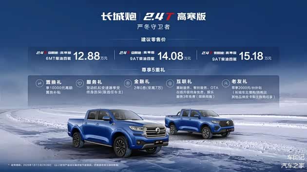 2.4T长城炮高寒版定位“中国高寒地区专属皮卡—严冬守卫者”,是为北方高寒地区用户打造的高性能专属车型,以硬核产品实力,打造全新驾乘体验。