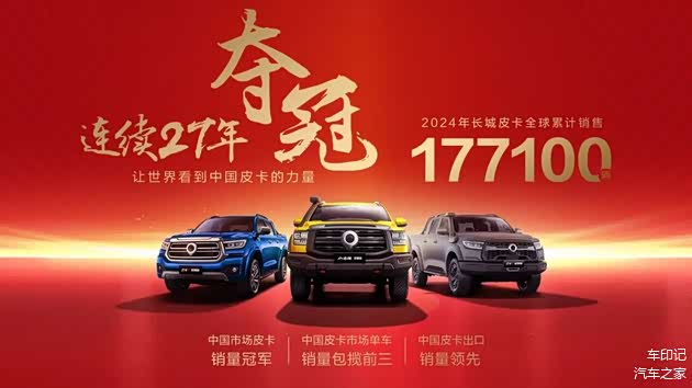 长城炮诞生仅5年多,全球累计销量已突破65万辆,累计51个月销量过万,蝉联中国皮卡销量冠军;更是助力长城皮卡2024年全球销量达177100辆,连续27年销量第一,全球累计销量近270万辆。长城皮卡以年度销量第一、市占率近50%、霸榜单车型销量前三、出口销量领先的全面领先优势,引领中国皮卡行业向上跃升。