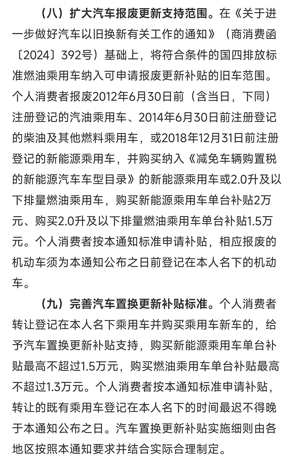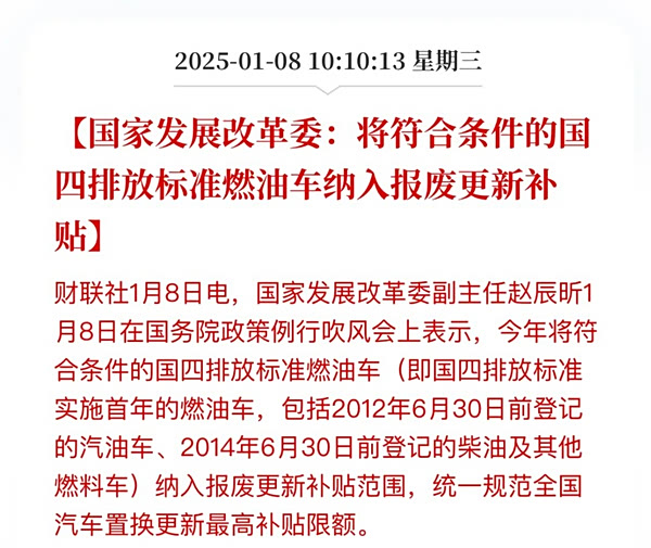 在《关于2025年加力扩围实施大规模设备更新和消费品以旧换新政策的通知》所提到报废2012年6月30日前注册登记的汽油乘用车,也就是把符合条件的国四排放燃油车纳入报废补贴范围,具体指国四排放标准实施首年的燃油车,包括2012年6月30日前的汽油车,以及2014年6月30日前登记的柴油及其他燃料车。