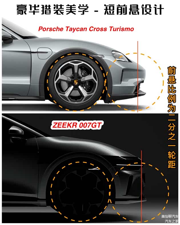 接下来,我们从轮比的角度进行分析,与保时捷Taycan Cross Turismo进行对比。两款车均采用了相同的轮比设计理念:前悬采用二分之一轮距的短前悬设计,后悬则为四分之三轮距,这样的设计有效扩大了后备箱空间。从整体比例来看,两款车型均接近轿车风格,其溜背斜线与第二轮距的四分之三处相契合。通过分析这两款车的轮比设计,我们不难发现,它们都遵循了经时间验证的经典设计法则,从而营造出更加和谐的视觉美感。